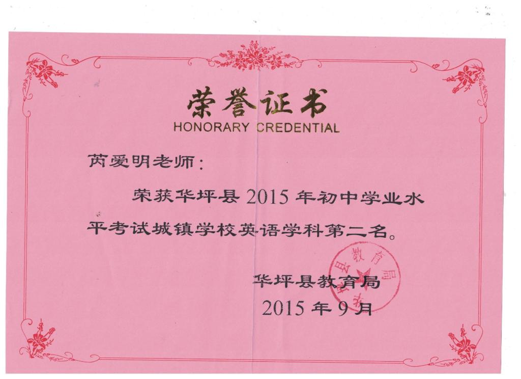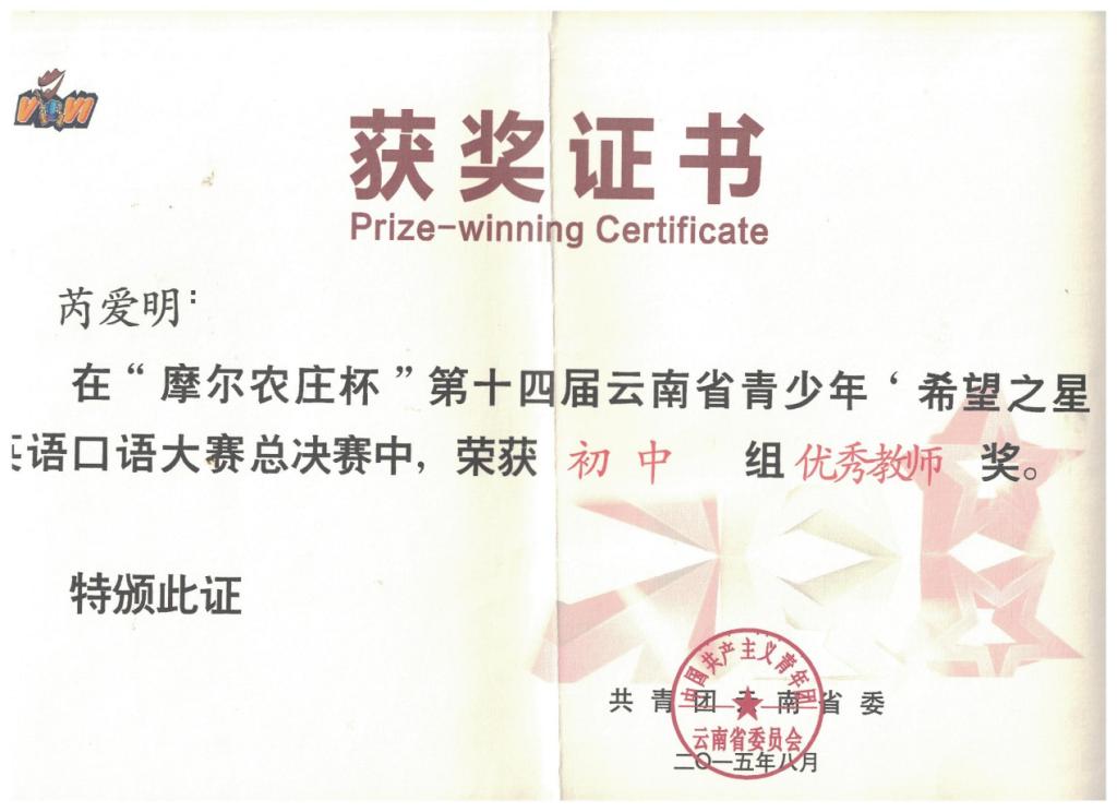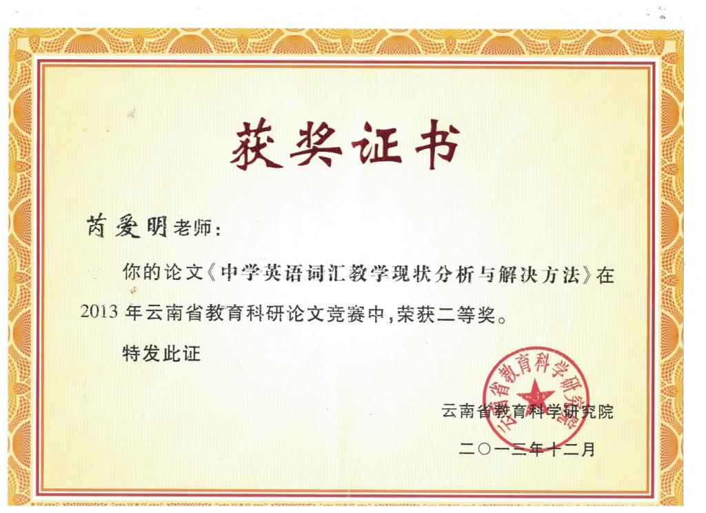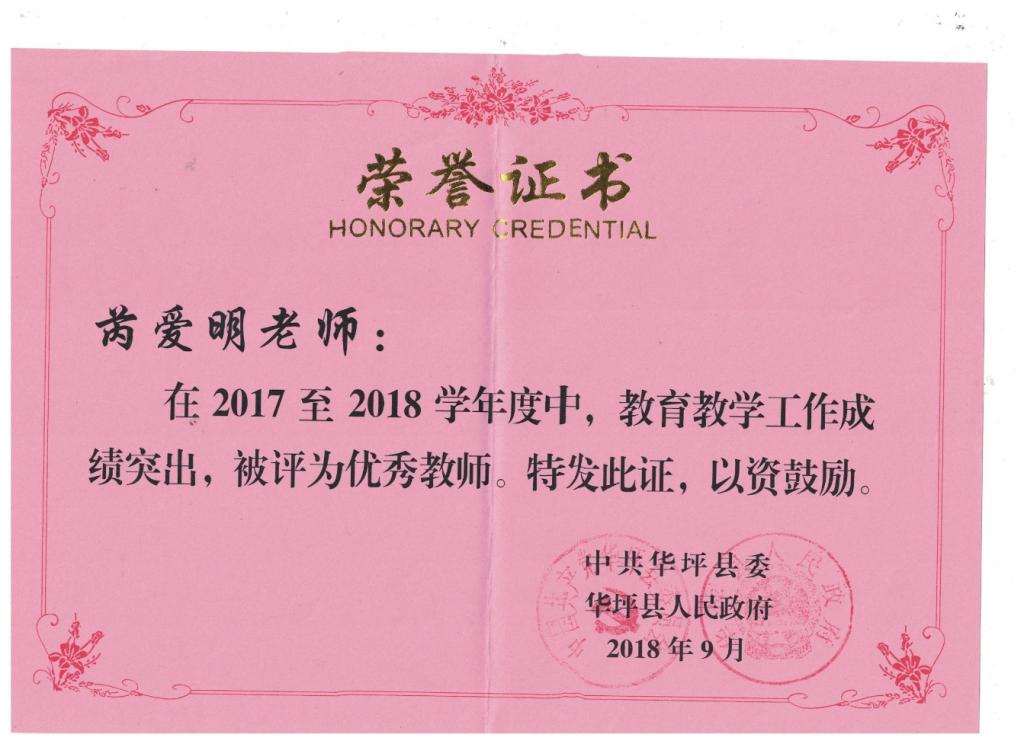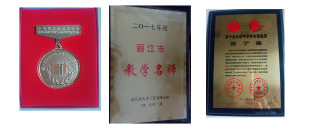 天道酬勤,通过这些年的努力,学校英语老师的教学水平得到了质的提高,全校学生的英语中考成绩多数班级这几年都占据了县里排名的前列,而我自己也得到了学校和上级部门的认可,2016年被县委组织部聘为华坪县初中英语名师工作室主持人;2017年被评为丽江市首届教学名师,丽江市行业专家库专家,华坪县县管优秀人才;2017年被评为第十届全国外语教师园丁奖;2018年被丽江市教育局聘为丽江市初中英语名师工作室主持人。华坪电视台在2015年对我做了题为《教海无涯,学做帆,乐作舟》的专题节目。丽江市电视台在2018年给我做了题为《初心不改,使命前行》的专题节目和报道。
