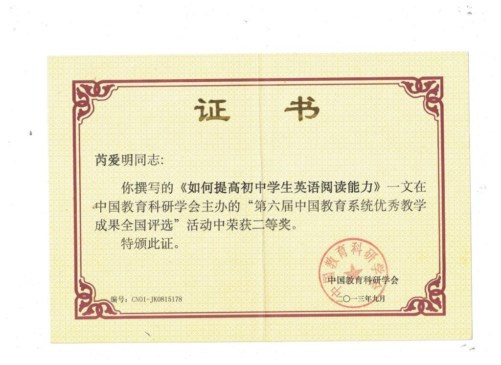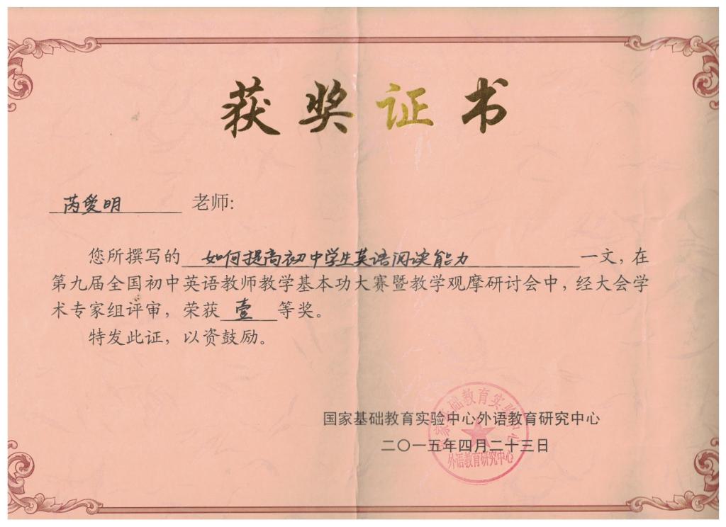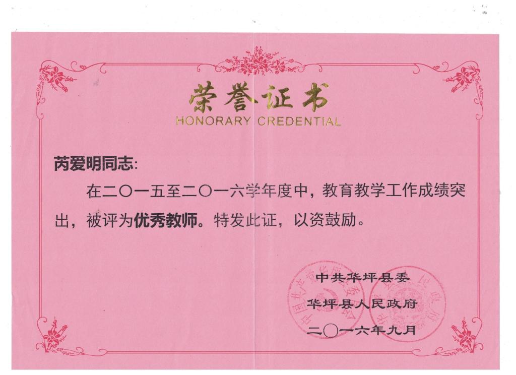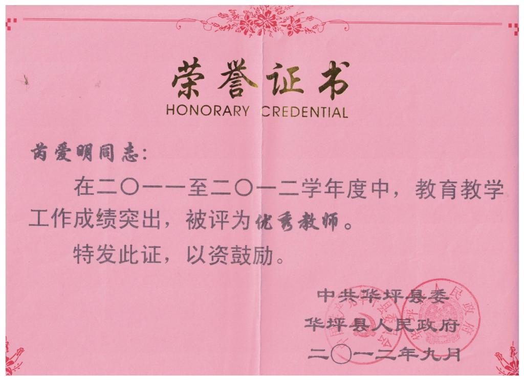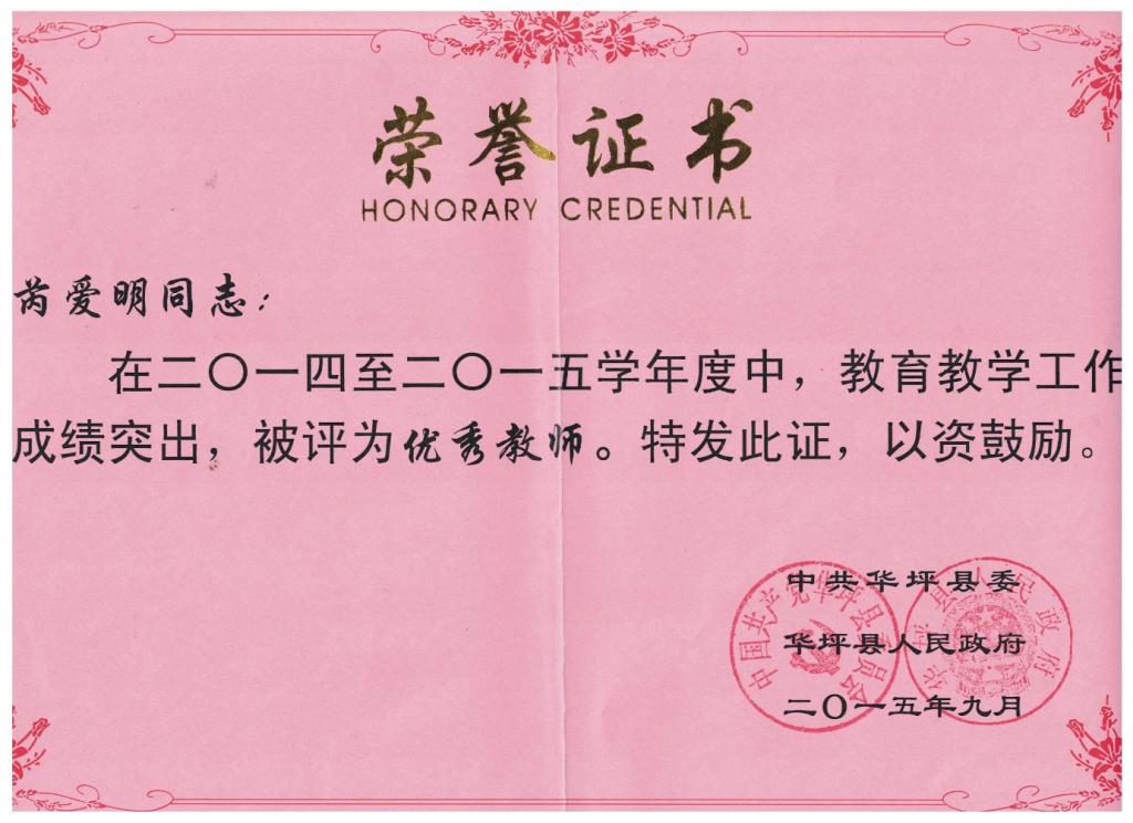 天道酬勤,通过这些年的努力,学校英语老师的教学水平得到了质的提高,全校学生的英语中考成绩多数班级这几年都占据了县里排名的前列,而我自己也得到了学校和上级部门的认可,2016年被县委组织部聘为华坪县初中英语名师工作室主持人;2017年被评为丽江市首届教学名师,丽江市行业专家库专家,华坪县县管优秀人才;2017年被评为第十届全国外语教师园丁奖;2018年被丽江市教育局聘为丽江市初中英语名师工作室主持人。华坪电视台在2015年对我做了题为《教海无涯,学做帆,乐作舟》的专题节目。丽江市电视台在2018年给我做了题为《初心不改,使命前行》的专题节目和报道。
