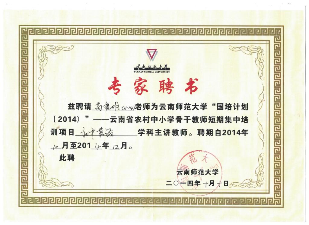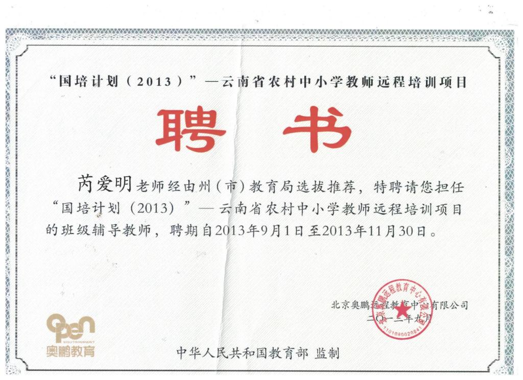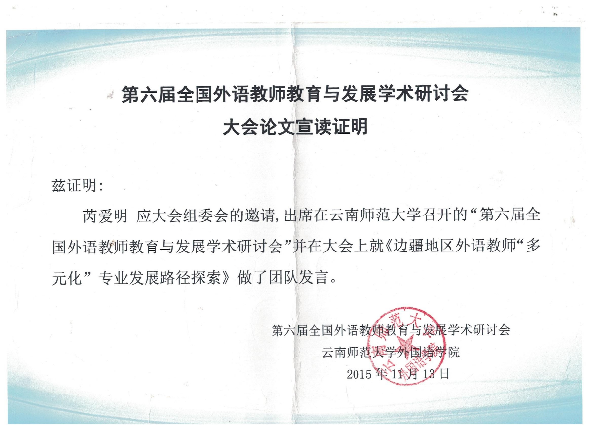 同时,我在教学实践中不断探索,也得到了云南师范大学外国语学院"国培"专家的认可,曾多次受邀主讲"国培"培训课程,把教学实践和教研组工作经验与更多学员进行交流、分享,培训效果良好,在这个过程中自己也获得了进一步的提升。
