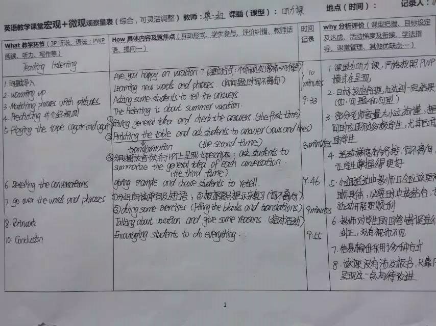 首先就从听课上进行改变,为了使老师们动起来,公开课有事可做,我借用了国培时的英语课堂观察量表,没有经过改动,也没有培训过老师,回校后的第一节公开课就把各个维度的表复印了,一股脑儿的发给学校的英语老师。至今仍然清晰的记得,老师们拿着表,一脸茫然,问我:"小芮,这是什么?干什么用的?"我告诉他们这是英语课堂观察量表,你们听课时要把它们填满,下课了交回来。多数老师很茫然的接过了六张表,可有三位老教师接过表一把撕了扔进了垃圾背篓,嘴里还说着:"没事干了,专门折磨人"!当时这情景让我很伤心。但课开始了,也没有来得及多想。开始边听边填表,课刚开始五分钟我就发现,这些表来不及都填,而且好些我也很疑惑,自己都不知道怎么填。自己也是手忙脚乱,下课了一份都没有填完,当然了,其他老师也如此!